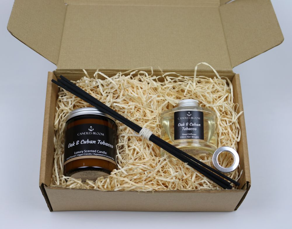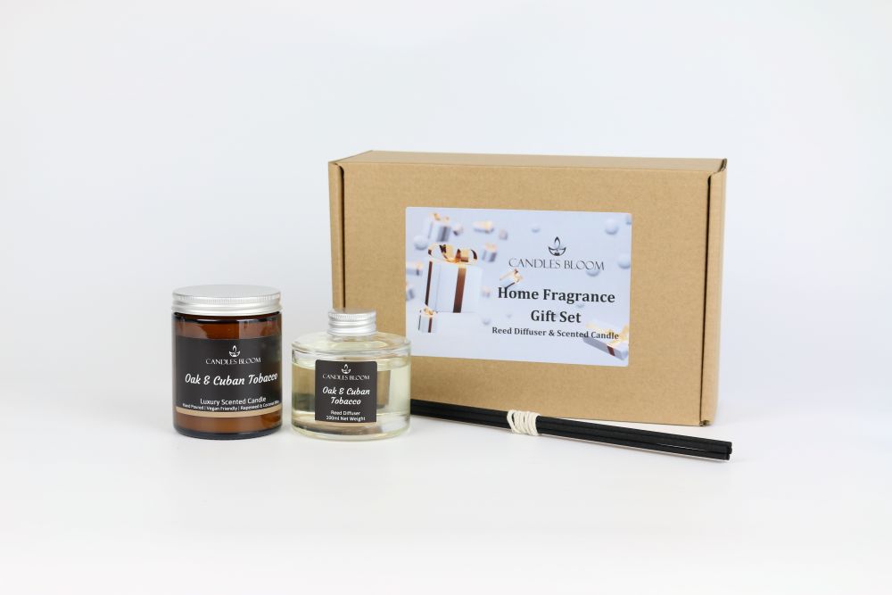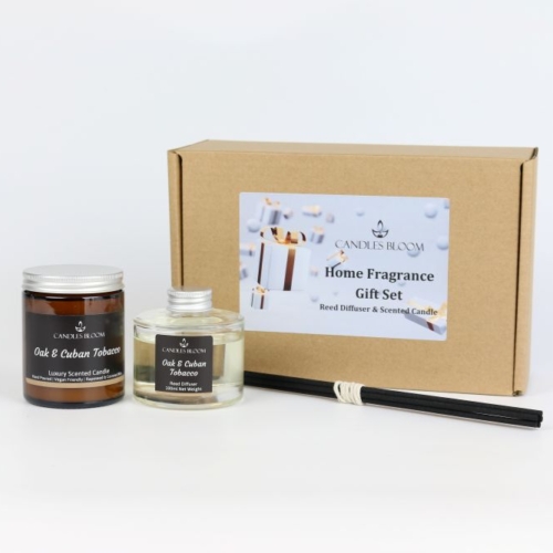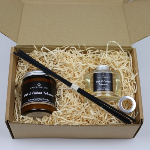 A beautifully curated gift set featuring a Oak & Cuban Tobacco scented candle and matching reed diffuser – perfect for creating a calming ambiance in any room.