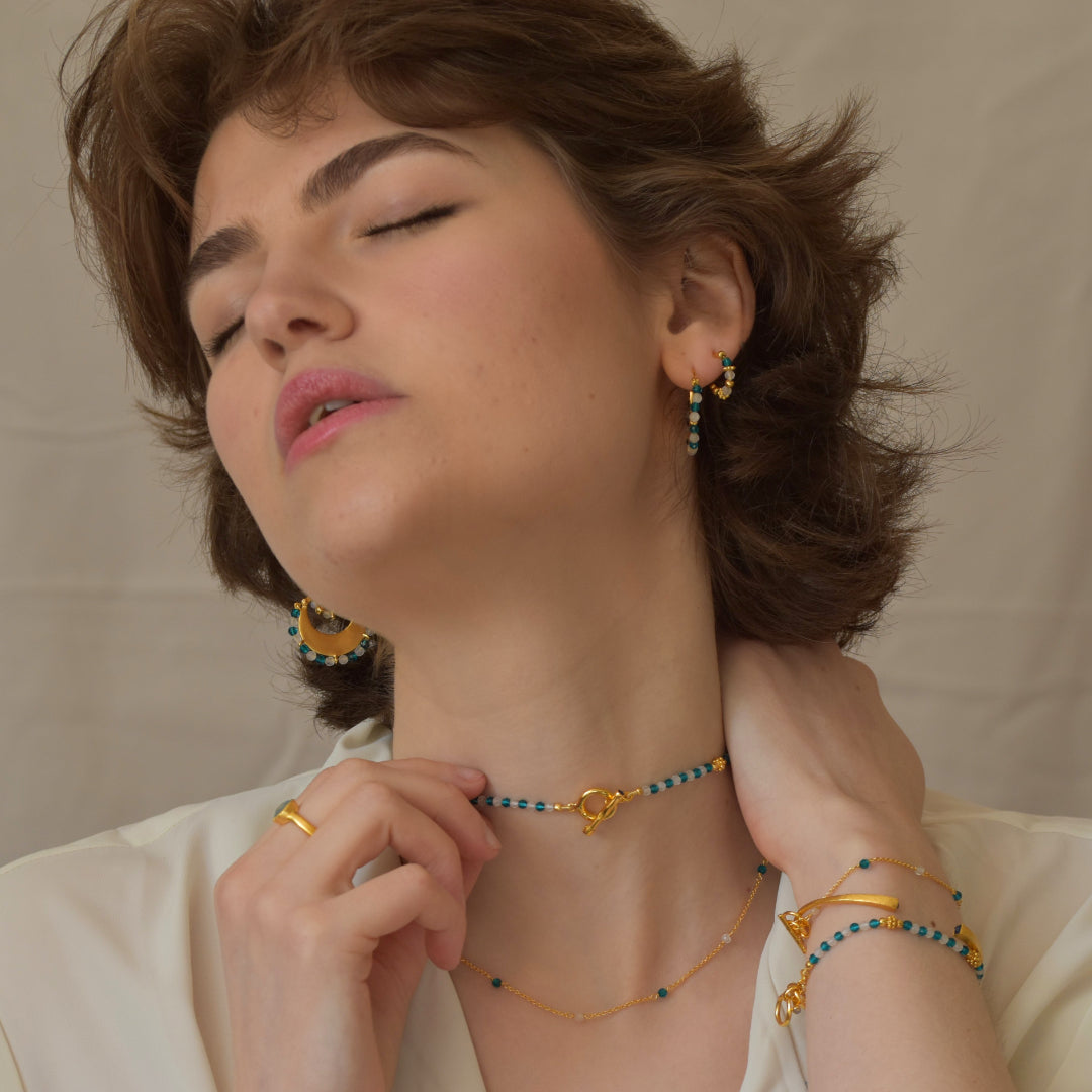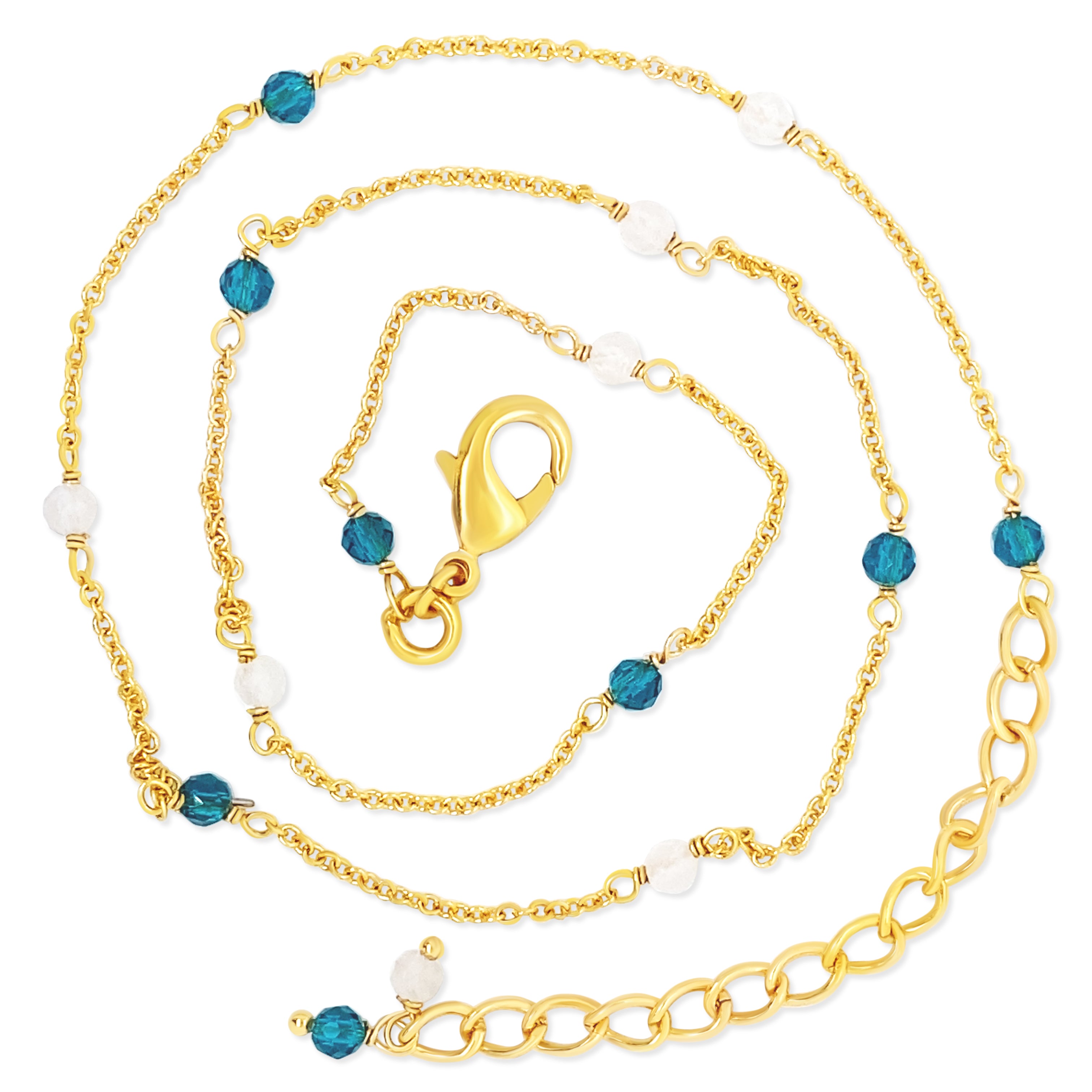 SYMBOLIC & HEALING PROPERTIES Moonstone promotes inner clarity, cyclical change and a deep connection to the feminine. It is a symbol of light, hope and new beginnings. FEATURES * Rainbow moonstone and apatite gemstones * Brass with 18k gold vermeil * All recycled metals * Recycled and recyclable box * Upcycled silk sari bag for safe keeping DESCRIPTION This charming chain necklace is a part of the mix and match Bead Collection, which includes necklaces, earrings, and bracelets. Alternating rainbow moonstone beads and neon (glass) apatite beads are delicately threaded onto a fine chain. Fastened with a lobster claw for added safety, the end of the chain boasts a rainbow moonstone bead and a neon apatite bead, adding a delightful detail to the design. Crafted from recycled brass with 2.5 microns of recycled 18k gold vermeil, this necklace is not only stylish but also environmentally conscious. It is perfect for pairing with other necklaces in this collection or with your other neckwear for that lovely layered look. DIMENSIONS The necklace measures 48cm in total, including a 6.5 cm extension piece, so it can be worn at different lengths. The gemstones are 3mm each. The metal is recycled .925 sterling silver with 2.5 microns of recycled 18k gold vermeil, so the gold will last very well.