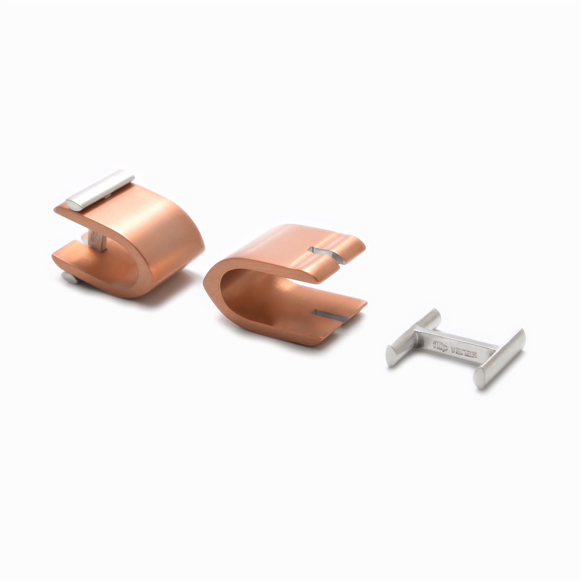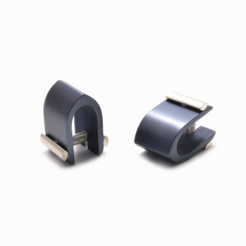 This is achieved with an innovative concept of a two part cuff link. The silver part in a shape of letter H goes through the button holes first. The aluminium part in the shape of pointed arch then clicks on to keep it in place and to provide the visual effect. Simple & effective, just as a good design should be.
