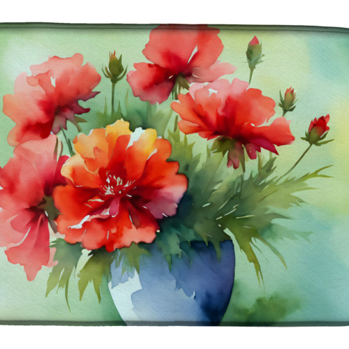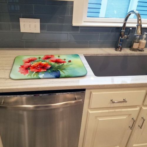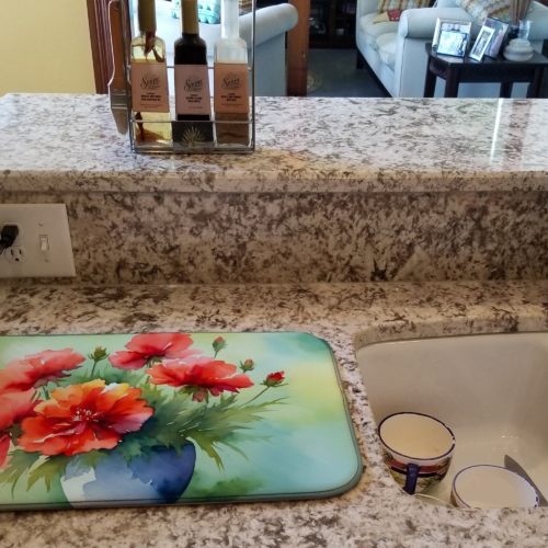 Dish Drying Mat featuring breed specific Ohio Scarlet Carnations artwork. Say goodbye to messy countertops and soggy dish towels with our innovative dish drying mat. Our high-quality dish drying pad is designed to keep your countertops dry while offering a stylish and efficient solution. Whether you’re air drying dishes, glasses, stemware, silverware, pots, pans, bottles, or even fruits and vegetables, our dish mat is the perfect choice. The 14 inches x 22 inches size fits most counters and dish drying racks, and the non-slip design ensures stability. Made with water-absorbent polyester and a polyurethane foam insert, our dish drying mat is not only functional but also durable. It’s machine washable and printed in the USA for long-lasting use. The beautiful artwork adds flair to your kitchen decor, making it a perfect housewarming gift or present for any occasion. Upgrade your kitchen experience with our absorbent and versatile dish drying mat.
