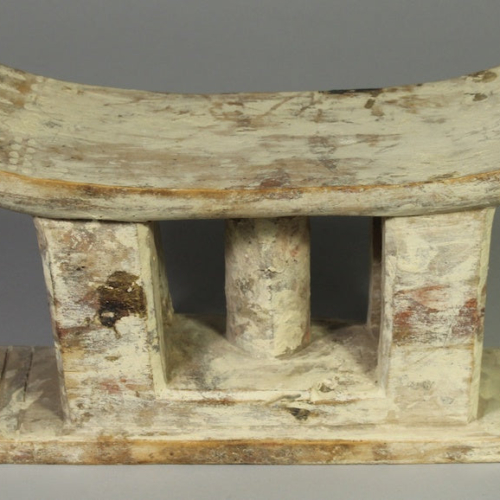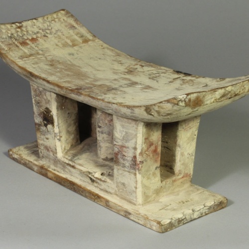 10 1/2 x 4 1/2 x 5 1/2″ tall (27 x 11.4 x 14 cm) This small stool, too small for human use as a stool, was kept by an Ewe person to accommodate an ancestor, resident in the spirit world. In this way the Ewe facilitate communication with the spirit world, their own ancestors, who, they believe, are instrumental in determining their own fate, controlling their own life here on Earth.