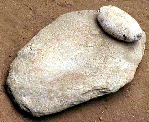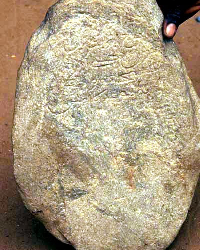 This is the reverse side of an old grinding stone on which are inscribed the words, loosely translated, in Arabic, “el hadj Abu Bakar, son of Awrah. God promised him a safe place in paradise,” indicating that the stone originally served as a grave marker, between 700 and 1000 years ago.