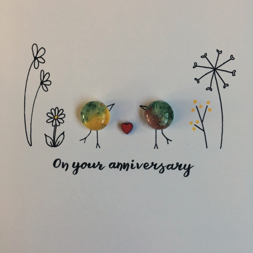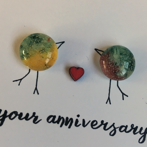 A greetings card with the simple message ‘on your anniversary’ featuring two fused glass birds, line drawn flowers and a small wooden heart.
