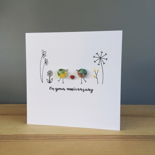 A greetings card with the simple message ‘on your anniversary’ featuring two fused glass birds, line drawn flowers and a small wooden heart.