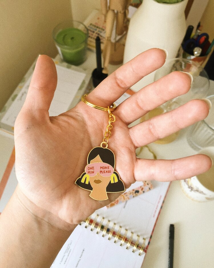 Metal Key Chain from illustration “One More Min Please”, created by Alja Horvat. Perfect for everyone who hates their alarm clock and likes to sleep a minute or two more in the morning.