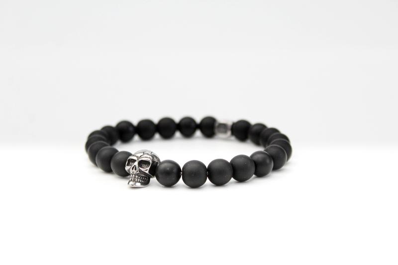 This bracelet is made from 8mm Matte Onyx natural stone beads. The bracelet is finished with a Purestone stainless steel logo bead and a stainless steel skull bead. Everything is strung on a strong elastic nylon thread to deliver a bracelet of the best quality possible.