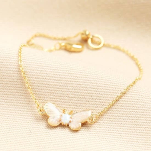 A trace chain bracelet made of 14ct gold platingFeaturing a butterfly charm with an opal centreMade with both a pulley clasp and lobster claspPerfect for summer-themed jewellery collections