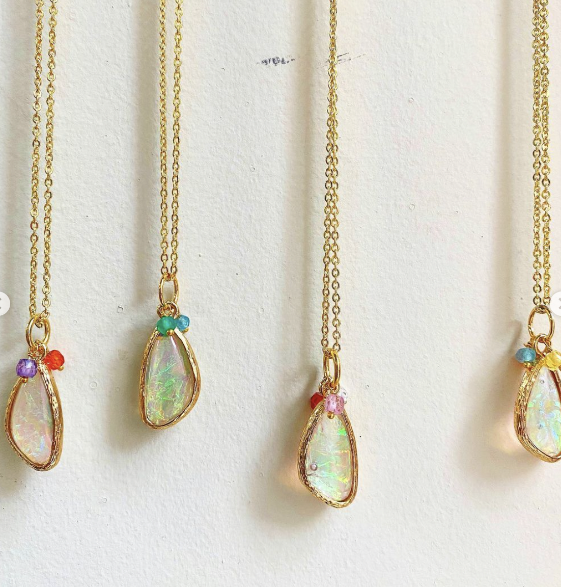 Handmade in New York City. A single multi-faceted faux Opal hangs from a gold plated brass chain. Accented by three rainbow crystals, this necklace is adjustable from 18-20 inches. Chain is dainty yet strong for durability and ease of wear. Clasp closure, one necklace per case pack.
