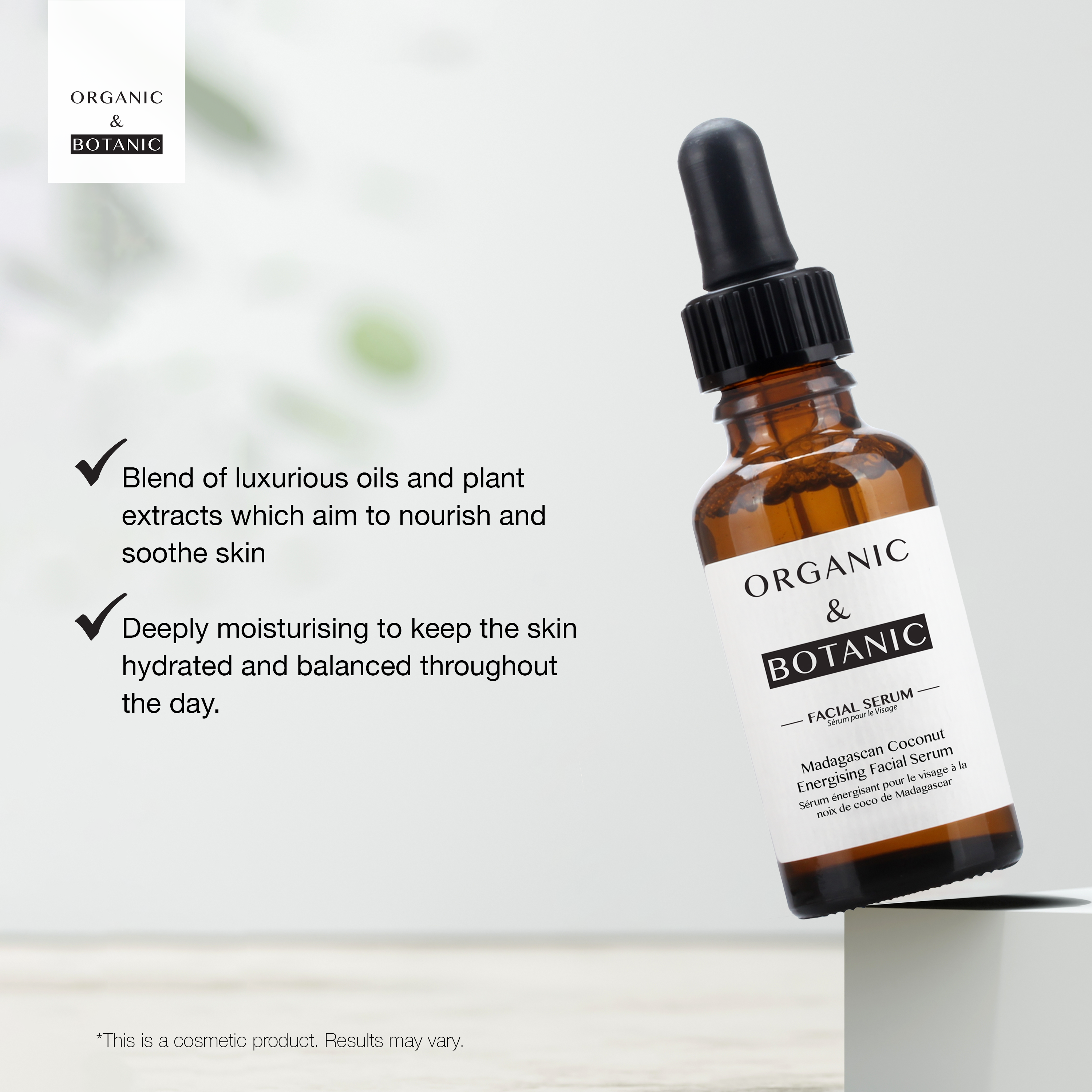 Rejuvenating facial serum for all skin types Reduces effects of skin aging Made with natural ingredients for healthier, more youthful-looking skin Our Madagascan Coconut Energising Facial Serum is a powerful skincare product that works to rejuvenate and revitalize the skin. It effectively reduces the effects of aging, leaving the skin firmer, smoother, and more vibrant. This serum is suitable for all skin types and is vegan-friendly.