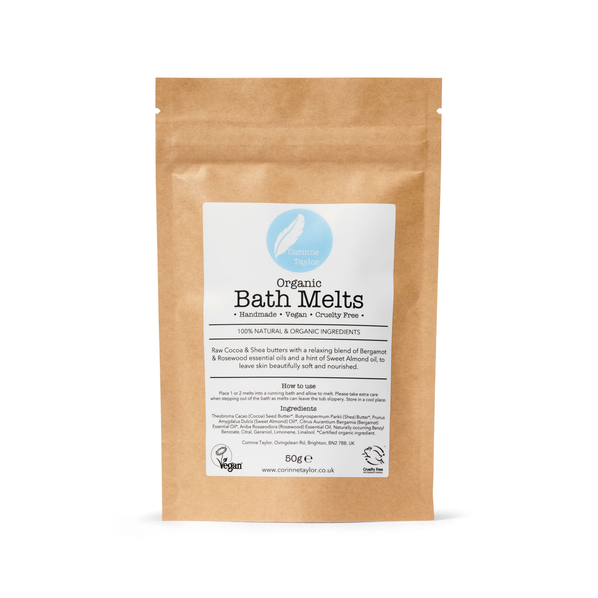 Our Organic Bath Melts are made using a nourishing and restorative blend of raw organic Shea & Cocoa butters and Sweet Almond Oil, to deeply moisturise and nourish skin. Rosewood and Bergamot essential oils are added to calm and relax whilst filling the bathroom with a beautiful natural aroma. When you step out of the bath your skin will be soft and smooth, as if you have moisturised all over with body butter!