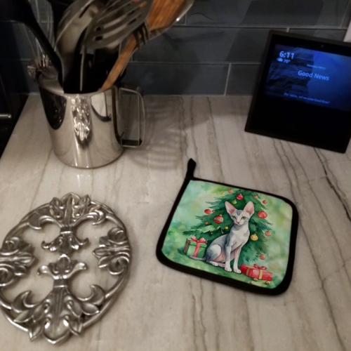 Pair of Pot Holders featuring breed specific Oriental Shorthair artwork. Celebrate Christmas with this Christmas Pair of Pot Holders. A Pair of Pot Holders to match your kitchen decor. Made in the USA these are thick and functional. Full color artwork decorates the front polyester fabric of the hot pad and accented by a black trim. Use these at as a trivet for your Thanksgiving or Christmas tablescape. Filled with insulated fabric and quilted for durability. These colorful pot holders will make a great gift for your favorite home cook or executive chef. Each pot holder measures approximately 7 1/2 inches by 7 1/2 inches. A hanging tab is included.