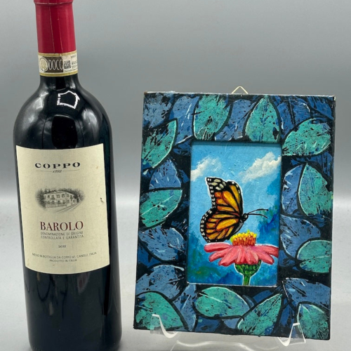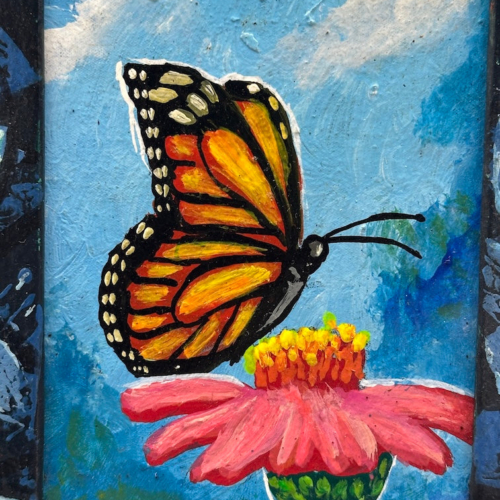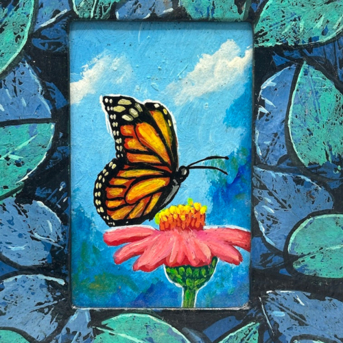 I found this small framed painting at a butterfly sanctuary along the road around the rim of the Ilopango Lake crater in El Salvador. Apparently the artist had asked the owner of the butterfly sanctuary, mariposario, to help him sell his paintings. This beautiful small work of art is on wood, framed. This lovely painting measures 7 1/2 x 6 x 1/4″ (19 x 15 x .6 cm)
