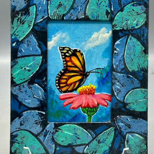 I found this small framed painting at a butterfly sanctuary along the road around the rim of the Ilopango Lake crater in El Salvador. Apparently the artist had asked the owner of the butterfly sanctuary, mariposario, to help him sell his paintings. This beautiful small work of art is on wood, framed. This lovely painting measures 7 1/2 x 6 x 1/4″ (19 x 15 x .6 cm)