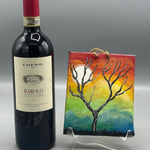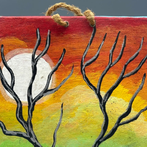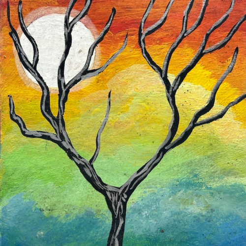 I found this small framed painting, of a leafless tree, at a butterfly sanctuary along the road around the rim of the Ilopango Lake crater in El Salvador. Apparently the artist, Fernando Cruz, had asked the owner of the butterfly sanctuary, mariposario, to help him sell his paintings. This beautiful small work of art is on canvas, wrapped tightly over wood. This lovely painting measures 6 1/8 x 5 x 3/16″ (15.5 x 12.7 x .5 cm)