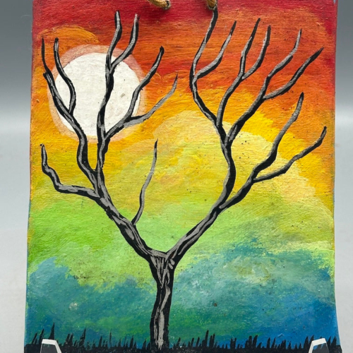 I found this small framed painting, of a leafless tree, at a butterfly sanctuary along the road around the rim of the Ilopango Lake crater in El Salvador. Apparently the artist, Fernando Cruz, had asked the owner of the butterfly sanctuary, mariposario, to help him sell his paintings. This beautiful small work of art is on canvas, wrapped tightly over wood. This lovely painting measures 6 1/8 x 5 x 3/16″ (15.5 x 12.7 x .5 cm)