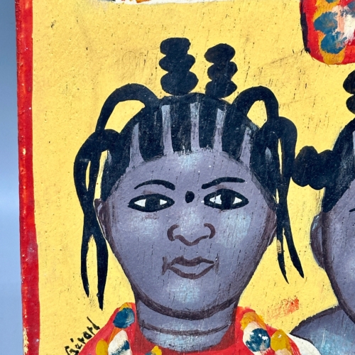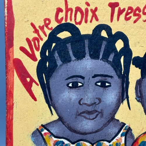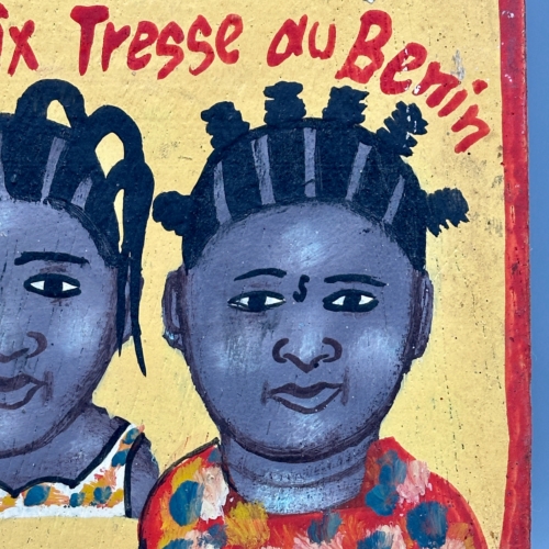 This sign is a small version, a replica, of a much larger commercial art painting that would have been commissioned by an artist, possibly even this very artist, to advertise her barbershop or beauty salon business. This artist signs his name “H. T. Gérard”; his studio is Arts Junior Benin. The artist painted this one to augment his income due to the appreciation for this art on a wider basis. We support him and his family when we buy his art as do you when you purchase it from us for which he and we thank you. The name of the business this sign would have been made to advertise is “Your Choice Hairdo in Benin”. This sign measures 8 5/8 x 5 15/16 x 1/8” (22 x 15.1 x .3 cm)