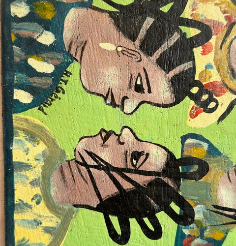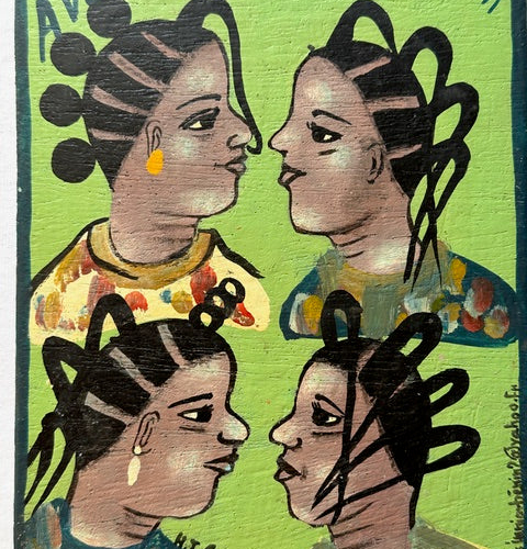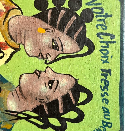 This sign is a small version, a replica, of a much larger commercial art painting that would have been commissioned by an artist, possibly even this very artist, to advertise her barbershop or beauty salon business. This artist signs his name “H. T. Gérard”; his studio is Arts Junior Benin. The artist painted this one to augment his income due to the appreciation for this art on a wider basis. We support him and his family when we buy his art as do you when you purchase it from us for which he and we thank you. The name of the business this sign would have been made to advertise is “A Votre Choix hairdo in Benin”. This sign measures approximately 8 1/2 x 6″ (22 x 15 x .3 cm)