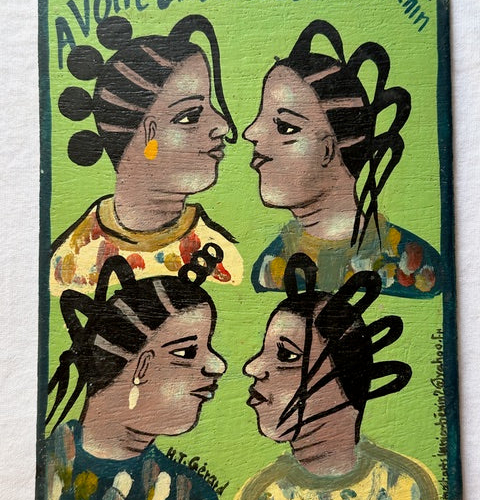 This sign is a small version, a replica, of a much larger commercial art painting that would have been commissioned by an artist, possibly even this very artist, to advertise her barbershop or beauty salon business. This artist signs his name “H. T. Gérard”; his studio is Arts Junior Benin. The artist painted this one to augment his income due to the appreciation for this art on a wider basis. We support him and his family when we buy his art as do you when you purchase it from us for which he and we thank you. The name of the business this sign would have been made to advertise is “A Votre Choix hairdo in Benin”. This sign measures approximately 8 1/2 x 6″ (22 x 15 x .3 cm)