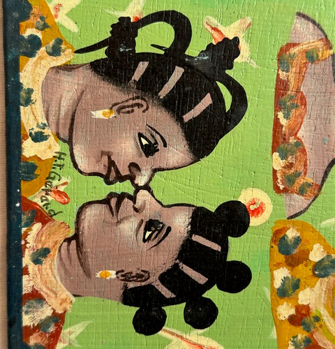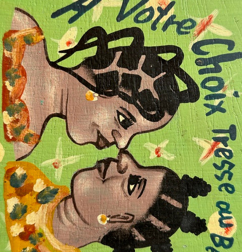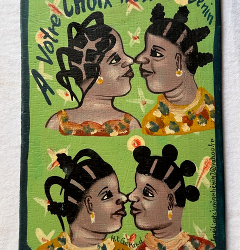 This sign is a small version, a replica, of a much larger commercial art painting that would have been commissioned by an artist, possibly even this very artist, to advertise her barbershop or beauty salon business. This artist signs his name “H. T. Gérard”; his studio is Arts Junior Benin. The artist painted this one to augment his income due to the appreciation for this art on a wider basis. We support him and his family when we buy his art as do you when you purchase it from us for which he and we thank you. The name of the business this sign would have been made to advertise is “A Votre Choix hairdo in Benin”. This sign measures approximately 8 1/2 x 6″ (22 x 15 x .3 cm)
