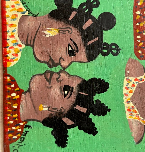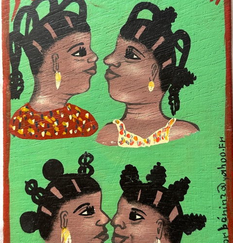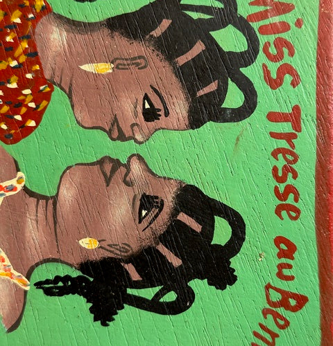 This sign is a small version, a replica, of a much larger commercial art painting that would have been commissioned by an artist, possibly even this very artist, to advertise her barbershop or beauty salon business. This artist signs his name “H. T. Gérard”; his studio is Arts Junior Benin. The artist painted this one to augment his income due to the appreciation for this art on a wider basis. We support him and his family when we buy his art as do you when you purchase it from us for which he and we thank you. The name of the business this sign would have been made to advertise is “Miss hairdo in Benin”. This sign measures approximately 8 1/2 x 6″ (22 x 15 x .3 cm)