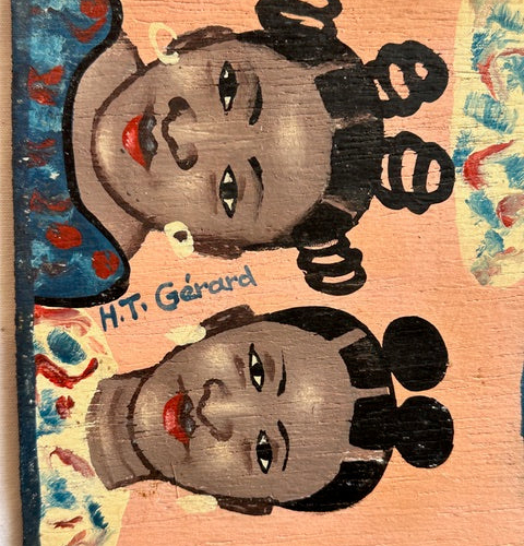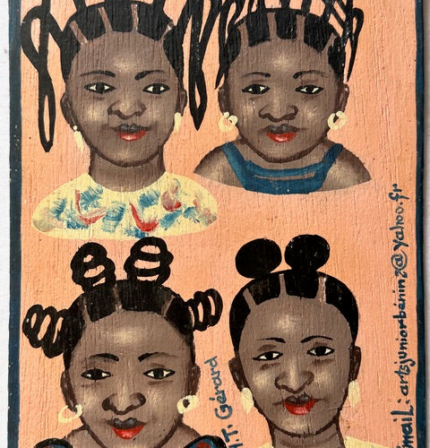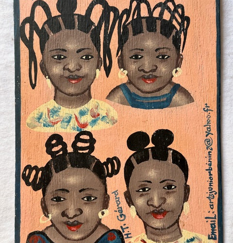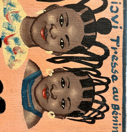 This sign is a small version, a replica, of a much larger commercial art painting that would have been commissioned by an artist, possibly even this very artist, to advertise her barbershop or beauty salon business. This artist signs his name “H. T. Gérard”; his studio is Arts Junior Benin. The artist painted this one to augment his income due to the appreciation for this art on a wider basis. We support him and his family when we buy his art as do you when you purchase it from us for which he and we thank you. The name of the business this sign would have been made to advertise is “di)vi hairdo in Benin”. This sign measures approximately 8 1/2 x 6″ (22 x 15 x .3 cm)