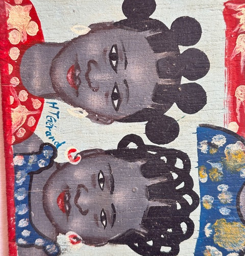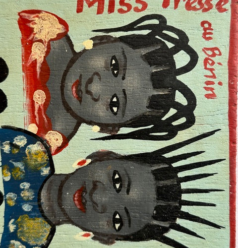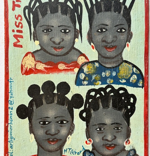 This sign is a small version, a replica, of a much larger commercial art painting that would have been commissioned by an artist, possibly even this very artist, to advertise her barbershop or beauty salon business. This artist signs his name “H. T. Gérard”; his studio is Arts Junior Benin. The artist painted this one to augment his income due to the appreciation for this art on a wider basis. We support him and his family when we buy his art as do you when you purchase it from us for which he and we thank you. The name of the business this sign would have been made to advertise is “Miss hairdo in Benin”. This sign measures approximately 8 1/2 x 6″ (22 x 15 x .3 cm)