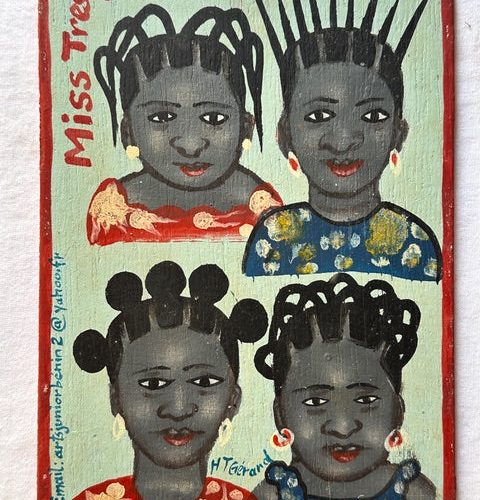 This sign is a small version, a replica, of a much larger commercial art painting that would have been commissioned by an artist, possibly even this very artist, to advertise her barbershop or beauty salon business. This artist signs his name “H. T. Gérard”; his studio is Arts Junior Benin. The artist painted this one to augment his income due to the appreciation for this art on a wider basis. We support him and his family when we buy his art as do you when you purchase it from us for which he and we thank you. The name of the business this sign would have been made to advertise is “Miss hairdo in Benin”. This sign measures approximately 8 1/2 x 6″ (22 x 15 x .3 cm)