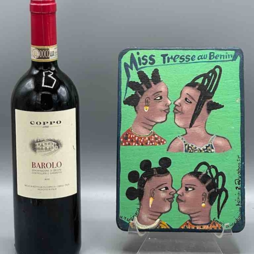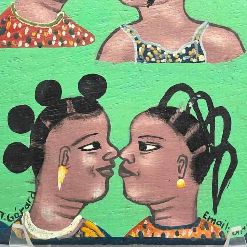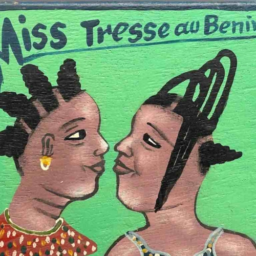 This sign is a small version, a replica, of a much larger commercial art painting that would have been commissioned by an artist, possibly even this very artist, to advertise her barbershop or beauty salon business. This artist signs his name “H. T. Gérard”; his studio is Arts Junior Benin. The artist painted this one to augment his income due to the appreciation for this art on a wider basis. We support him and his family when we buy his art as do you when you purchase it from us for which he and we thank you. The name of the business this sign would have been made to advertise is “Miss Hairdo in Benin”. This sign measures 8 5/16 x 6 x 1/8” (21 x 15.2 x .3 cm)