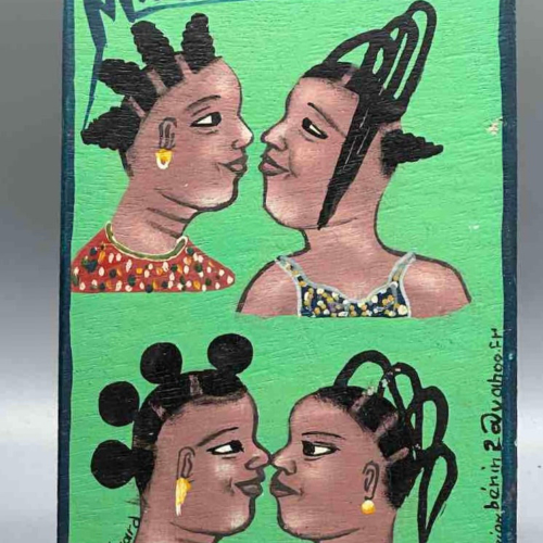 This sign is a small version, a replica, of a much larger commercial art painting that would have been commissioned by an artist, possibly even this very artist, to advertise her barbershop or beauty salon business. This artist signs his name “H. T. Gérard”; his studio is Arts Junior Benin. The artist painted this one to augment his income due to the appreciation for this art on a wider basis. We support him and his family when we buy his art as do you when you purchase it from us for which he and we thank you. The name of the business this sign would have been made to advertise is “Miss Hairdo in Benin”. This sign measures 8 5/16 x 6 x 1/8” (21 x 15.2 x .3 cm)