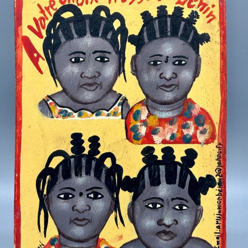 This sign is a small version, a replica, of a much larger commercial art painting that would have been commissioned by an artist, possibly even this very artist, to advertise her barbershop or beauty salon business. This artist signs his name “H. T. Gérard”; his studio is Arts Junior Benin. The artist painted this one to augment his income due to the appreciation for this art on a wider basis. We support him and his family when we buy his art as do you when you purchase it from us for which he and we thank you. The name of the business this sign would have been made to advertise is “Your Choice Hairdo in Benin”. This sign measures 8 5/8 x 5 15/16 x 1/8” (22 x 15.1 x .3 cm)