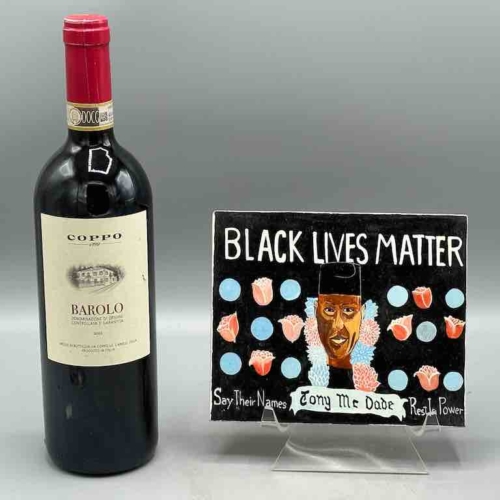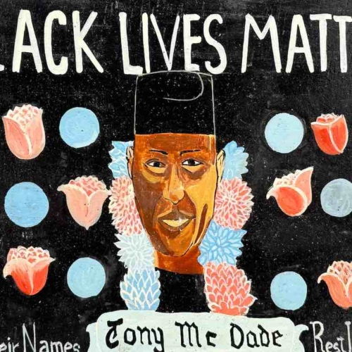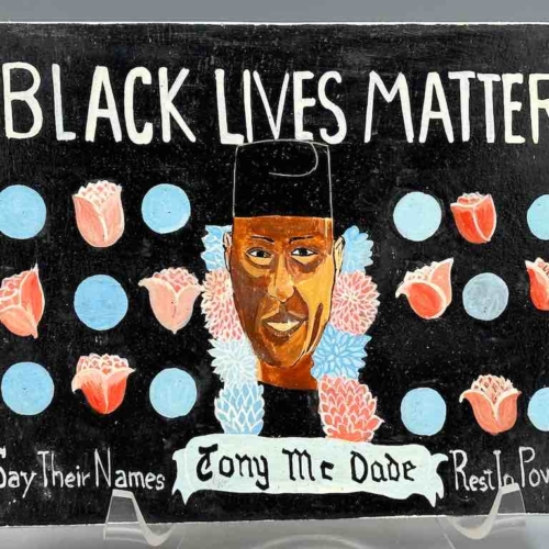 The world, including Africans, pays close attention to events in America. A strong testament to this phenomenon is this artwork which was painted in the wake of the 2020 George Floyd murder in 2021 by a young African artist in Togo. This artist signs his name “A. Folly”. The artist painted this to take advantage of the strong focus around the world on the rights of black people everywhere, especially in the US and across Africa. It appears that he reproduced images he found on the internet of a wide range of African and US events. This painting, of Tony McDade, reminds us of the shooting of that young black transgender man in 2020. This sign measures 6 7/8 x 5 3/4 x 1/8” (17.5 x 14.6 x .3 cm)