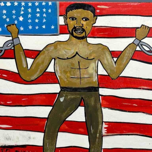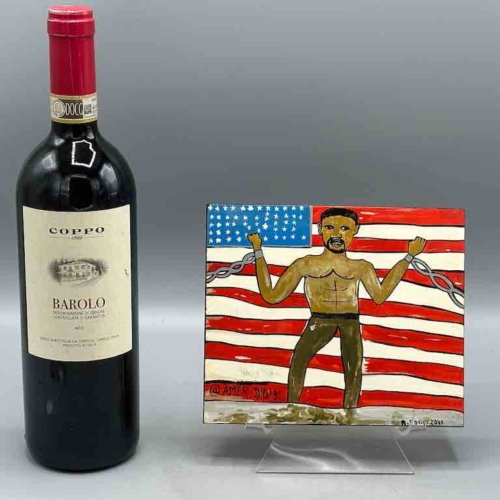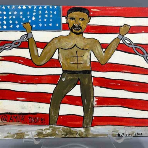 The world, including Africans, pays close attention to events in America. A strong testament to this phenomenon is this artwork which was painted in the wake of the 2020 George Floyd murder in 2021 by a young African artist in Togo. This artist signs his name “A. Folly”. The artist painted this to take advantage of the strong focus around the world on the rights of black people everywhere, especially in the US and across Africa. It appears that he reproduced images he found on the internet of a wide range of African and US events. I don’t recognize this specific imagery but it is clearly representative of the black experience in America, an experience Africans focus on in their support of black rights around the world. This sign measures 6 7/8 x 5 3/4 x 1/8” (17.5 x 14.6 x .3 cm)
