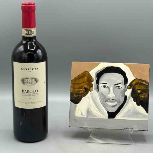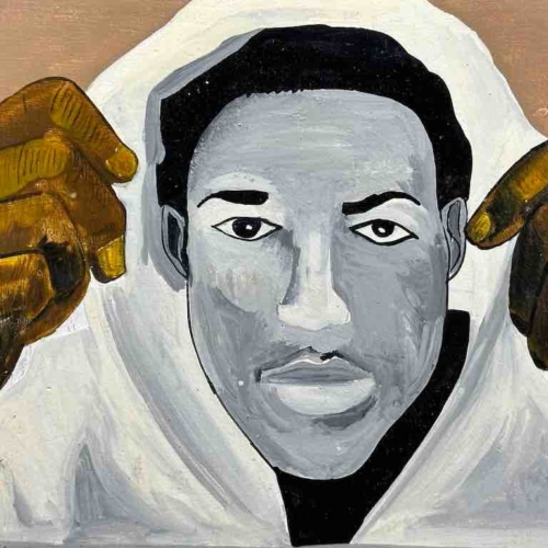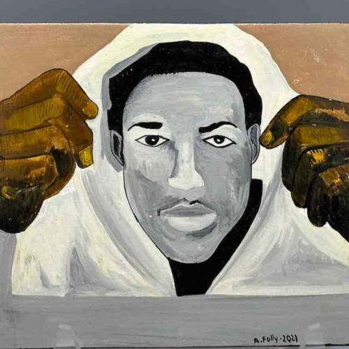 The world, including Africans, pays close attention to events in America. A strong testament to this phenomenon is this artwork which was painted in the wake of the 2020 George Floyd murder in 2021 by a young African artist in Togo. This artist signs his name “A. Folly”. The artist painted this to take advantage of the strong focus around the world on the rights of black people everywhere, especially in the US and across Africa. It appears that he reproduced images he found on the internet of a wide range of African and US events. This painting, of Trayvon Martin reminds us of the “stand your ground” shooting of that young black man in 2012. This sign measures 6 7/8 x 5 3/4 x 1/8” (17.5 x 14.6 x .3 cm)
