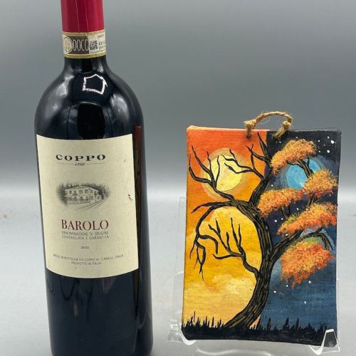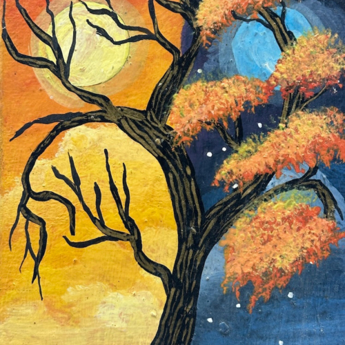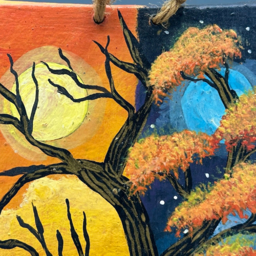 I found this small framed painting, of a tree, half in daylight and half at night, at a butterfly sanctuary along the road around the rim of the Ilopango Lake crater in El Salvador. Apparently the artist had asked the owner of the butterfly sanctuary, mariposario, to help him sell his paintings. This beautiful small work of art is on canvas, wrapped tightly over wood. This lovely painting measures 6 x 4 1/4 x 3/16″ (15 x 11 x .5 cm)
