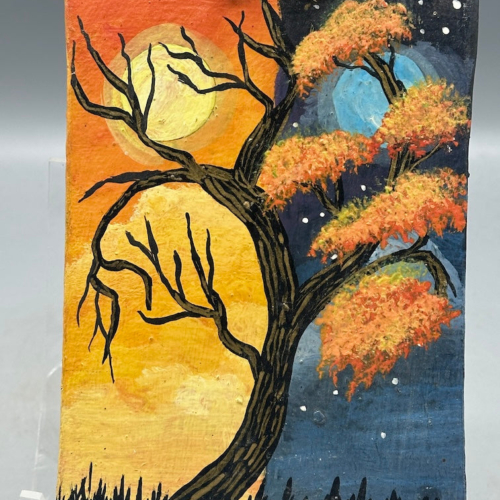 I found this small framed painting, of a tree, half in daylight and half at night, at a butterfly sanctuary along the road around the rim of the Ilopango Lake crater in El Salvador. Apparently the artist had asked the owner of the butterfly sanctuary, mariposario, to help him sell his paintings. This beautiful small work of art is on canvas, wrapped tightly over wood. This lovely painting measures 6 x 4 1/4 x 3/16″ (15 x 11 x .5 cm)