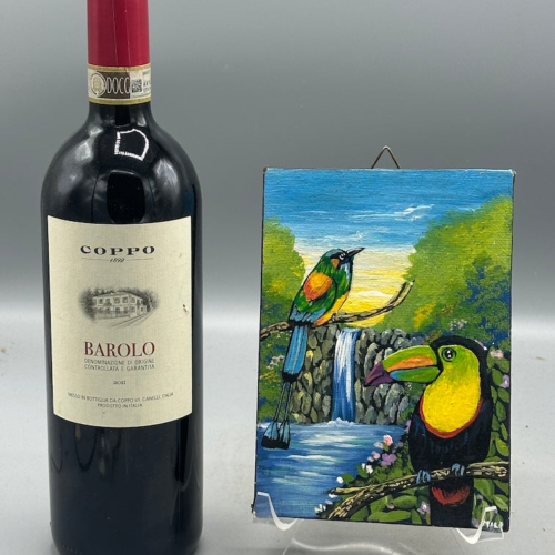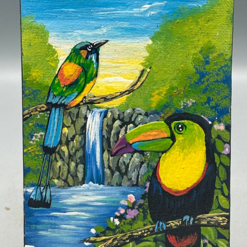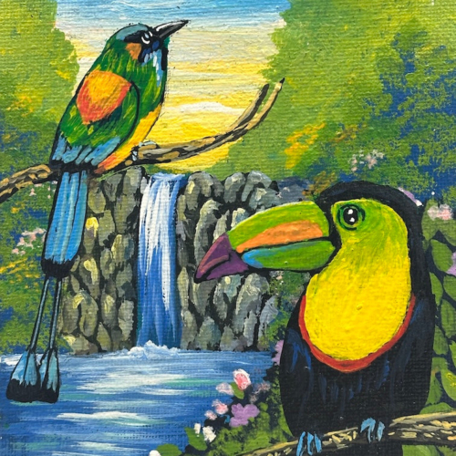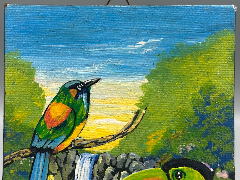 I found this small painting at a butterfly sanctuary along the road around the rim of the Ilopango Lake crater in El Salvador. Apparently the artist had asked the owner of the butterfly sanctuary, mariposario, to help him sell his paintings. This beautiful small work of art is on canvas, on a wooden stretcher. This lovely painting measures 6 3/4 x 4 3/4 x 9/16″ (17 x 12 x 1.4 cm)