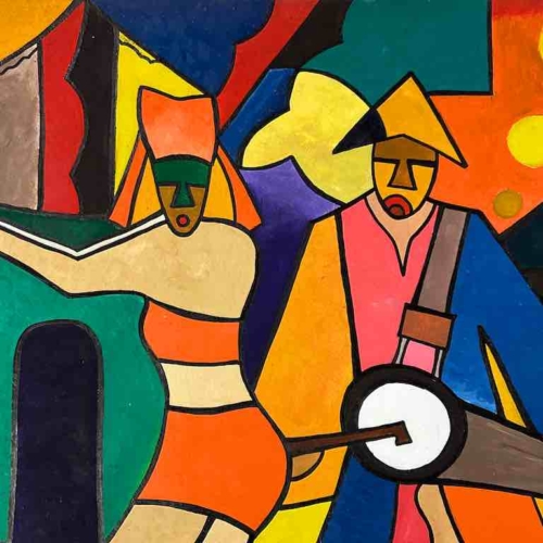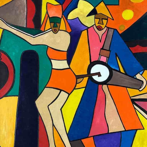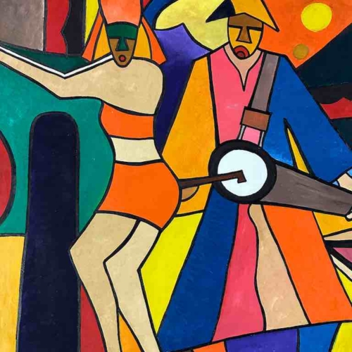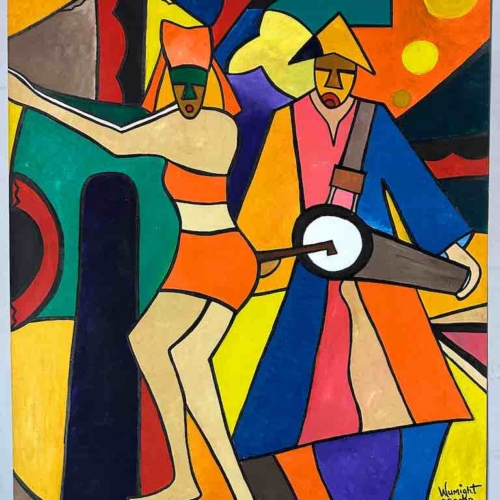I met the artist of this original artwork, Martins, aka Wumight, when he came to see me in Lome, Togo, to show me his work. He is from the city of Osogbo (pronounced Oshogbo) in Nigeria. He is one of the many students of the Osogbo School, established by Europeans there in the 1960’s in order to teach African art students European techniques of painting, using their own unique, African inspiration. Martins has entitled this painting, “Dancing to the Drum”. This painting measures 25 x 20 1/2″ (63.5 x 52 cm).