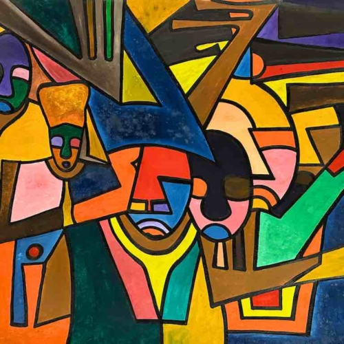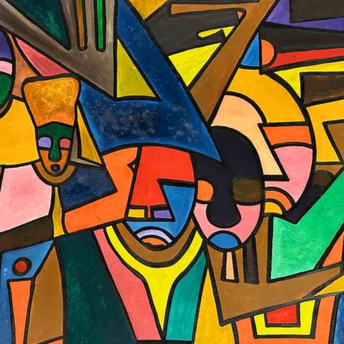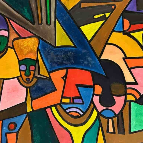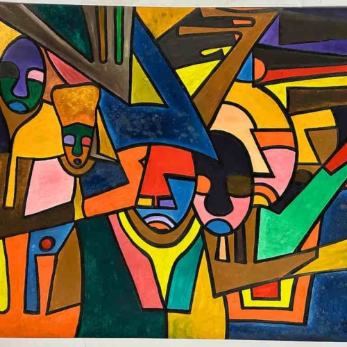 I met the artist of this original artwork, Martins, aka Wumight, when he came to see me in Lome, Togo, to show me his work. He is from the city of Osogbo (pronounced Oshogbo) in Nigeria. He is one of the many students of the Osogbo School, established by Europeans there in the 1960’s in order to teach African art students European techniques of painting, using their own unique, African inspiration. Martins entitled this painting, “Jubilation”This painting measures 25 x 20 1/2” (63.5 x 52 cm).