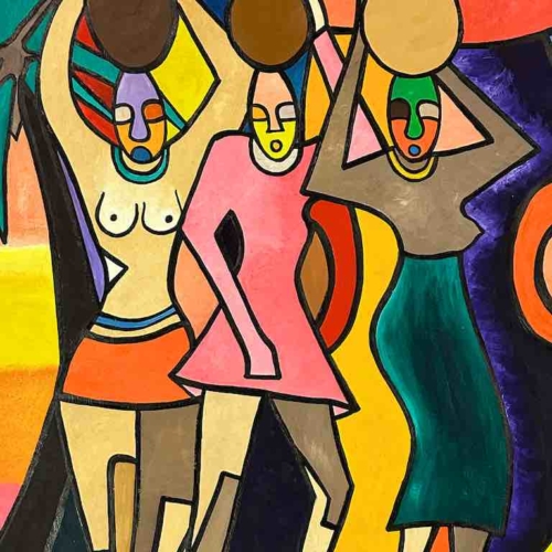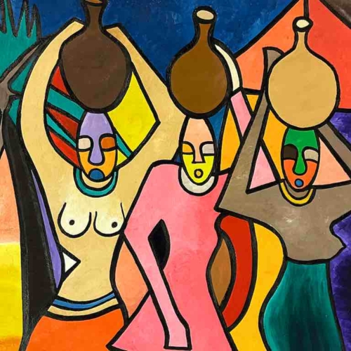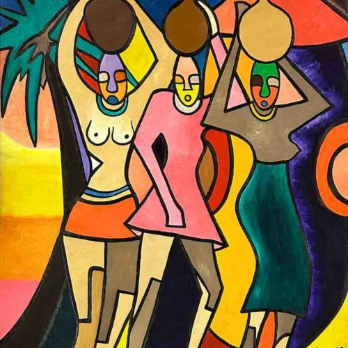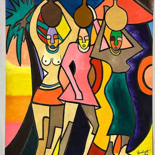 I met the artist of this original artwork, Martins, aka Wumight, when he came to see me in Lome, Togo, to show me his work. He is from the city of Osogbo (pronounced Oshogbo) in Nigeria. He is one of the many students of the Osogbo School, established by Europeans there in the 1960’s in order to teach African art students European techniques of painting, using their own unique, African inspiration. Martins entitled this painting, “Abundant of the River”This painting measures 25 x 20 1/2” (63.5 x 52 cm).
