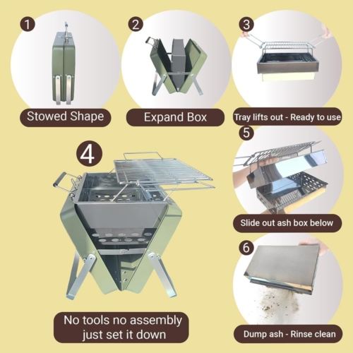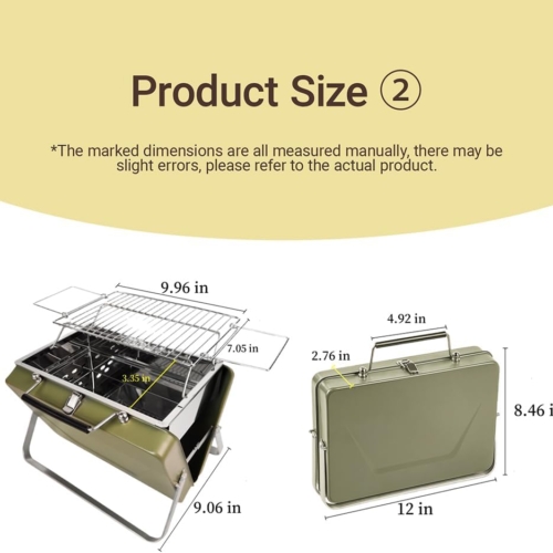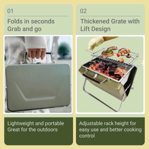 Compact & Carry-Anywhere Design:Our portable BBQ grill and small charcoal grill portable unfolds into a suitcase that fits in backpacks, car trunks, or bike panniers—ideal for camping grill, small grill outdoor, or tabletop grill adventures.Thoughtful Design & Adjustable Rack:This small portable grill features an adjustable grill rack that lets you grill charcoal, add coals, and tweak heat on the fly—no assembly needed. Integrated tray and charcoal box open together in seconds. Disassemble for cleaning or convert the frame into a wood-burning stove.Premium Materials & Durability:Built as a charcoal BBQ grill and barbecue grill, it features a thick chrome-plated grate, a ventilated stainless steel charcoal box and handle for easy transport, sturdy aluminum-alloy legs in a triangular frame for stability, and a powder-coated iron body that resists rust and fading.Tool-Free, Fast Setup & Pack-Up:No tools required—unfold this folding grill, portable charcoal grill for camping, or outdoor grill and start cooking in seconds. Collapses back into suitcase form in five seconds—grab and go with your small BBQ or small outdoor grill.Safe & Versatile Gift:This small BBQ grill charcoal, portable BBQ charcoal grill, tabletop charcoal grill, grill small, and mini BBQ grill offers a safer, smoke-flavor cooking experience with no gas leaks. Perfect as a portable grill table gift for any adventure lover.