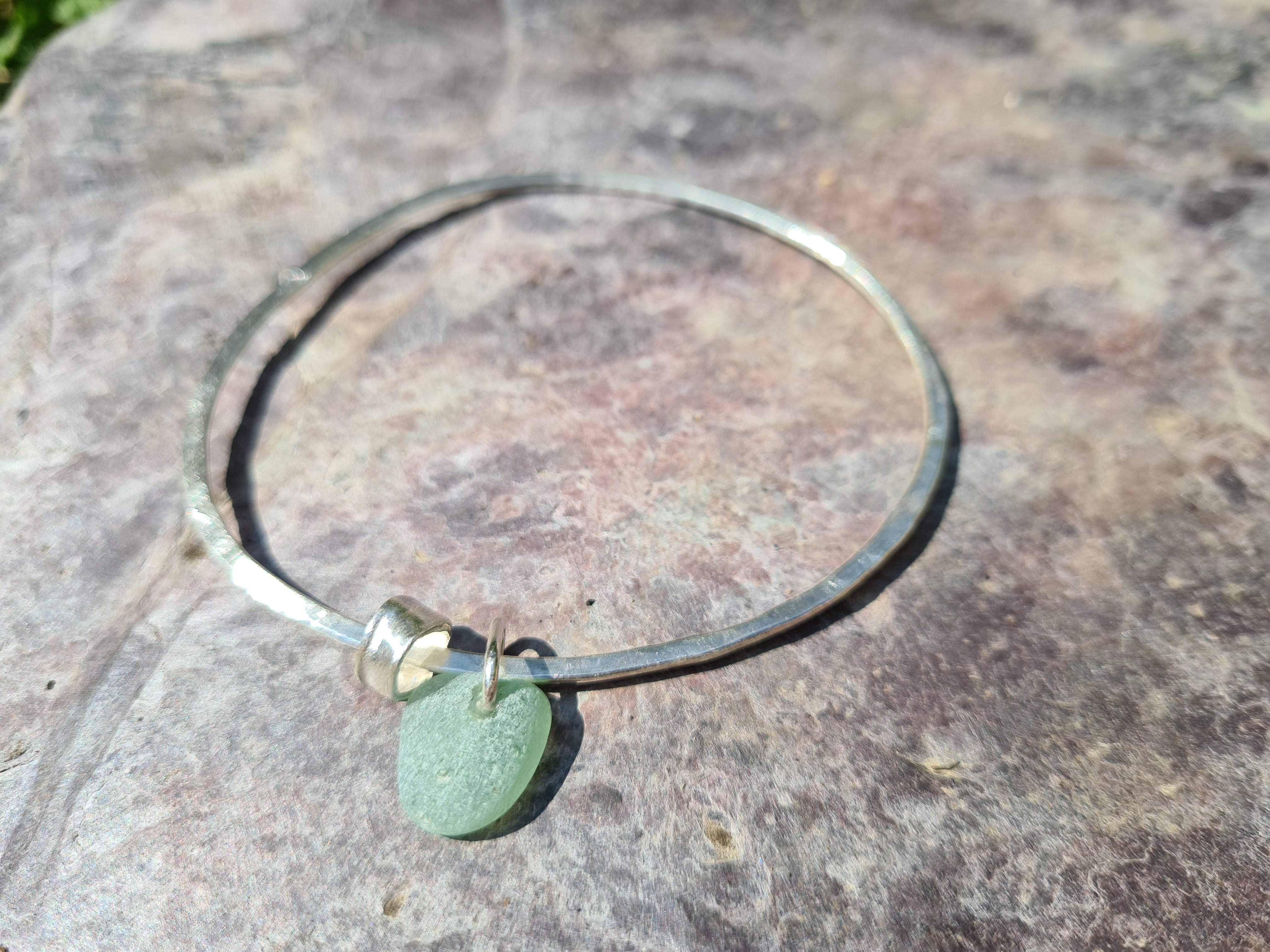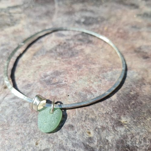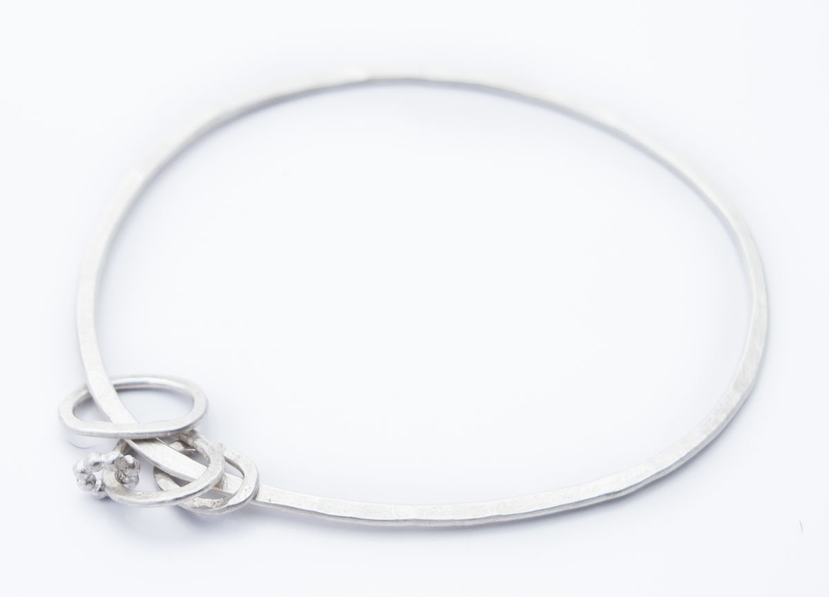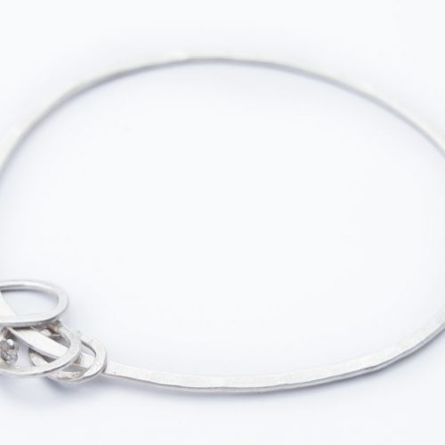 Handmade hammered sterling eco-silver 2mm wide pebble-shaped bangle, embellished with 3 random oval rings, one with a mini-beaded charm. Also available in oxidised silver for an antique finish, or with bras charms for contrast. Add more and more charms as you go if you like…All my jewellery is gift-wrapped in tissue or recycled card giftboxes.What is ecosilver? Eco-silver is a green alternative to sterling silver. It is a little bit more expensive but has the same silver content as sterling, it’s just made of 100% recycled and scrap silver products. Eco Silver can be both treated and worked with in the same way as silver, for the same quality results but more environmentally friendly. Produced from scrap jewellery, medical equipment, electronics and giftware, all the eco silver I use comes with a certificate of authenticity and is hallmarked if it is the required weight.
