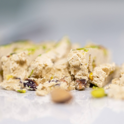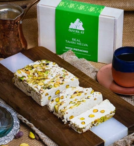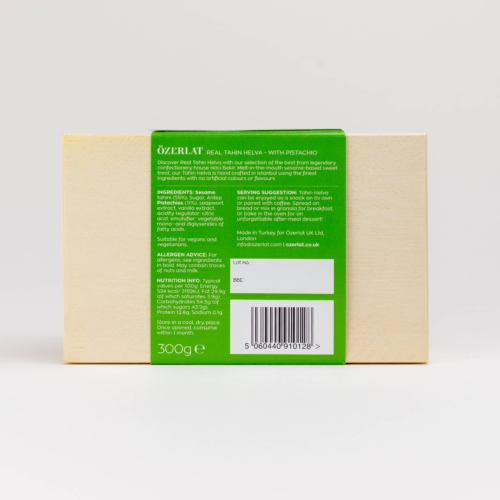 Discover real Tahin Helva with our selection of the best from the oldest confectionery house in Istanbul. Melt-in-the-mouth sesame-based sweet treat, our Tahin Helva is handcrafted in Istanbul using the finest ingredients with no artificial colours or flavours. The nutty sesame tahini and sweet sugar is well balanced with the flavourful Antep Pistachios. The Tahin Helva comes packaged in 300g wooden box. Ingredients: Sesame tahini (55%), sugar, Antep Pistachios (11%), soapwort extract, vanilla extraact, acidity regulator (citric acid), emulsifier: vegetable mono- and diglyserides of fatty acids. NUTRITION INFO: Typical values per 100g: Energy 524kcal/2192kJ, Fat 29.9g (of which saturates 3.9g), Carbohydrates 54.5g (of which sugars 43.5g), Protein 12.8g, Sodium 0.1g. Store in a cool and dry place away from direct sunlight and humidty. Once opened, consume within 1 month. Please note our BBE is UK format -DD/MM/YYYY.