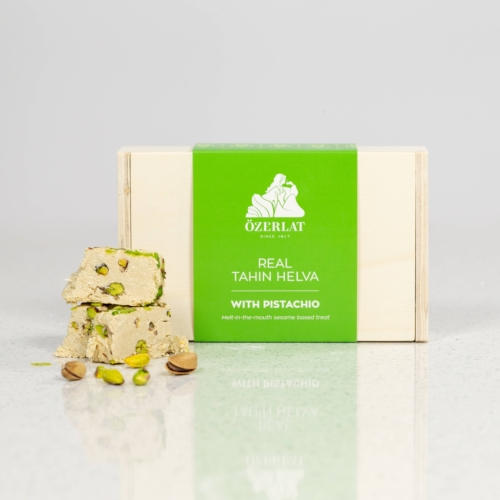 Discover real Tahin Helva with our selection of the best from the oldest confectionery house in Istanbul. Melt-in-the-mouth sesame-based sweet treat, our Tahin Helva is handcrafted in Istanbul using the finest ingredients with no artificial colours or flavours. The nutty sesame tahini and sweet sugar is well balanced with the flavourful Antep Pistachios. The Tahin Helva comes packaged in 300g wooden box. Ingredients: Sesame tahini (55%), sugar, Antep Pistachios (11%), soapwort extract, vanilla extraact, acidity regulator (citric acid), emulsifier: vegetable mono- and diglyserides of fatty acids. NUTRITION INFO: Typical values per 100g: Energy 524kcal/2192kJ, Fat 29.9g (of which saturates 3.9g), Carbohydrates 54.5g (of which sugars 43.5g), Protein 12.8g, Sodium 0.1g. Store in a cool and dry place away from direct sunlight and humidty. Once opened, consume within 1 month. Please note our BBE is UK format -DD/MM/YYYY.