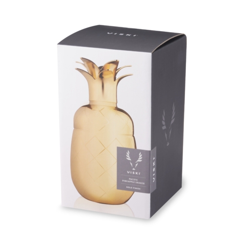 Add a tropical twist to your barware collection. Crafted from stainless steel with a polished gold finish, this eye-catching shaker brings fun and sophistication to your cocktail hour. The three-piece design includes a built-in strainer and a cap shaped like pineapple leaves, ensuring both style and functionality for your favorite drinks. Stainless steel construction Polished gold finish Built-in strainer and cap 3-piece shaker design Unique pineapple shape
