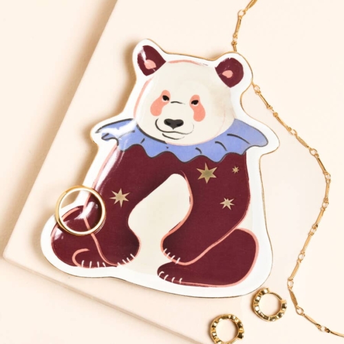 A small ceramic trinket dish shaped like a pandaFinished in purple and white with gold sparkle accentsFeatures a ruffled blue collar and painted pink cheeksMade from: ceramic