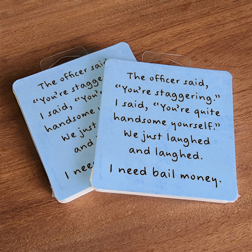 Paper Bar Coaster. Sold in shrink-wrapped sets of 6. Made from 4-ply ultra-sturdy paper cardboard, these coasters will keep your surfaces dry and protected. But it’s the hilarious, funny humorous sayings and quotes printed on the front that really make them stand out. From drinking humor to dating to sarcastic and silly, we have a coaster for every sense of humor. And with 100 designs to choose from, you can mix and match to fit your personal style. Disposable coasters printed on both sides are sure to make conversation! These coasters make a great gift for men and women alike and are sure to be a hit at any party or gathering. Plus, with their sassy and modern style, they’re a fun and unique addition to any home or office. Don’t let boring coasters ruin the fun – upgrade to our hilarious funny drink coaster