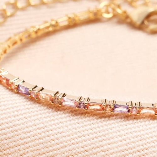With pastel purple, pink and orange baguette crystals alternating across the front of the bracelet encased in 14ct gold plating, this is the best way to add a subtle shine to your look. Fastening with a lobster clasp and extender chain, this adjustable bracelet is a must-have for your collection. Dimensionsinner circumference – 14.6cm with a 5cm extender chainMade from14ct gold plated brass, crystal
