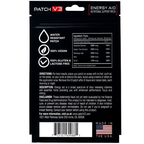 The Energy Aid dermal patch gives you a natural kick without pills, energy drinks or sugar. It’s a natural booster filled with antioxidants and B-12 to help keep your energy up throughout the day. Our energy patches are loved by athletes, busy parents, and professionals alike!
