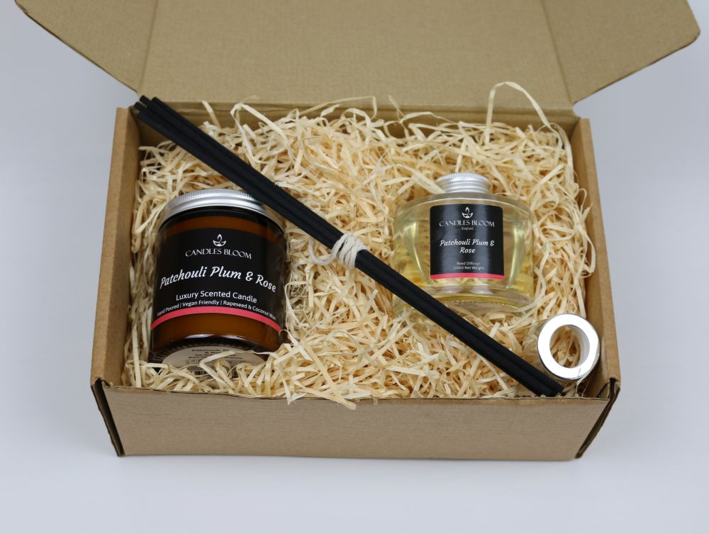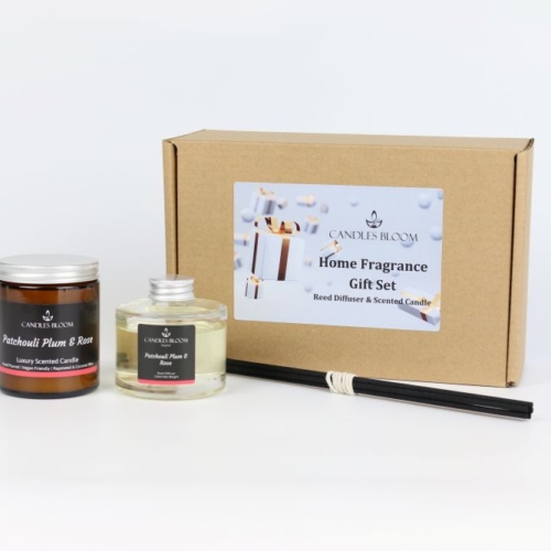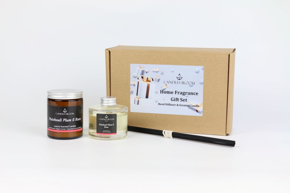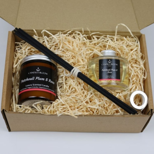 A beautifully curated gift set featuring a Patchouli Plum & Rose scented candle and matching reed diffuser – perfect for creating a calming ambiance in any room.