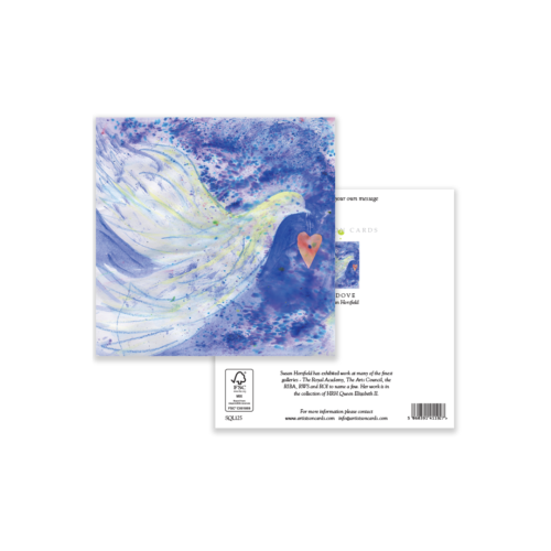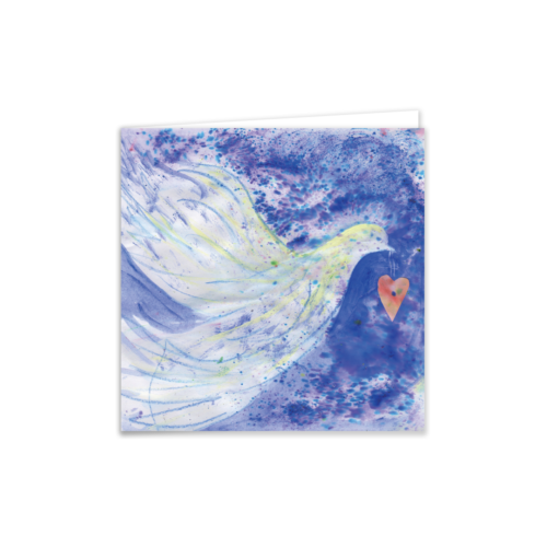 An elegant design featuring a white dove carrying a heart, painted in flowing watercolour and pastel textures. This versatile card is suitable for love, sympathy, weddings, and spiritual occasions.